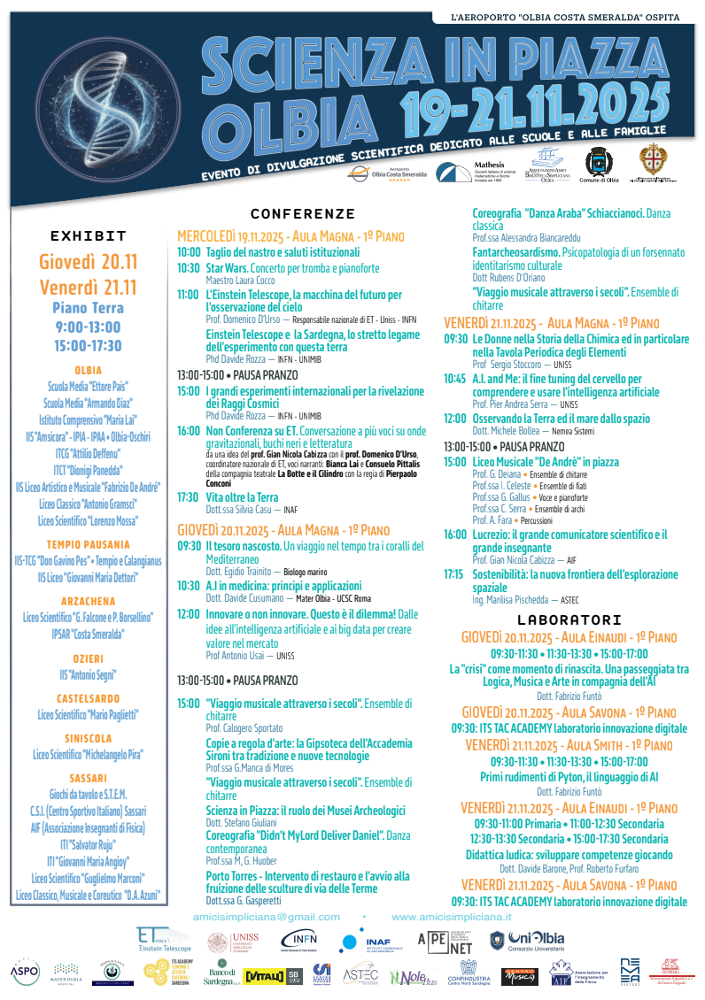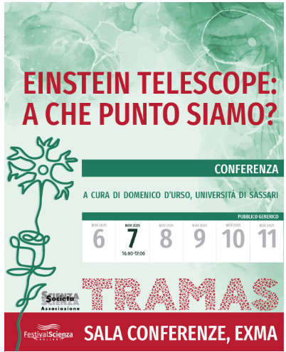 Partecipazione ad eventi Giornata INGV sull’Einstein Telescope Roma 20 novembre 2025ore 14:30 La Collaborazione ET Italia - Prof. Domenico D'Urso Scienza in Piazza Olbia 19 novembre 2025il prof. Domenico D'Urso, Responsabile nazionale di ET-UNISS-INFN, interverrà con il seguente programma:ore 11:00L’Einstein Telescope, la macchina del futuro per l’osservazione del cieloore 16:00Non Conferenza su ET conversazione a più voci su onde gravitazionali, buchineri e letteratura - da una idea del prof Cabizza con Prof. Domenico D’Ursocoordinatore nazionale di ET, voci narranti: Bianca Lai e Consuelo Pittalisdella compagnia teatrale La Botte e il Cilindro con la regia di PierpaoloConconi. Programma Einstein Telescope - Festival della Scienza di Cagliari 7 novembre 2025 - Prof. Domenico D'Urso Beyond Crisis and Grief: Rethinking Conservation Narratives_ Prof. Marco Malavasi Festival dell’Aerospazio 2025 Olbia 16-18 ottobre 2025Sostenibilità, intesa come chiave per il futuro del settore aerospaziale e per il benessere del pianetaIn qualità di Coordinatore Nazionale di ET Italia, il Prof. Domenico D’Urso ha partecipato come ospite al panel dedicato all’Einstein Telescope (ET) nell’ambito del Festival dell’Aerospazio. Il Telescopio Einstein e il contributo della geologia a supporto della candidatura italiana_Prof. Luca Cardello Geometric Problems in Linear & Nonlinear PDEs-Prof. Francesca Gladiali Workshop AI-TranspWood - Future Perspectives of Transparent Wood_Proff. Alberto Mariani e Daniele Nuvoli Conoscere il Mare per Proteggere il Futuro_Proff. Giulia Ceccherelli e Gabriella La Manna Conferenza stampa del progetto di riforestazione di poseidonia oceanica a Cala di Volpe_Prof. Giulia Ceccherelli Naviga la sezione Seminari Workshop Convegni Scuole Partecipazione ad eventi Incontri con gli studenti