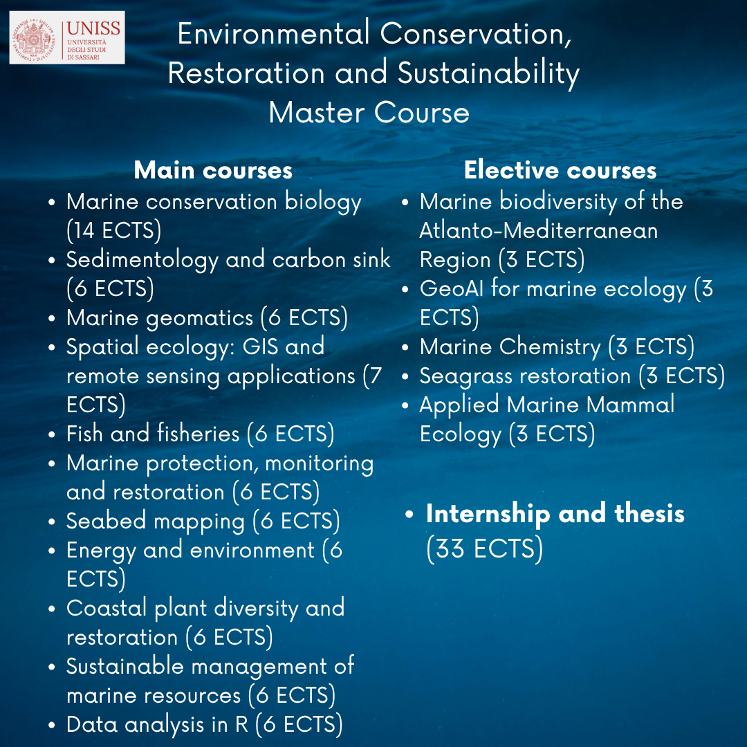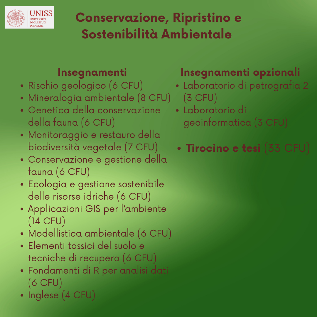 Environmental Conservation, Restoration and Sustainability Il Corso di Laurea Magistrale in Environmental Conservation, Restoration and Sustainability è declinato in due curricula: il Marino prevalentemente erogato in inglese, ed il Terrestre prevalentemente erogato in italiano. In entrambi i curricula si affrontano, a diversa scala spaziale e temporale, problematiche legate alla conservazione dei sistemi naturali. Il Corso si propone di formare la figura del Naturalista esperto della conservazione, del ripristino e della sostenibilità ambientale, un laureato magistrale con competenze multidisciplinari, in grado di svolgere e coordinare attività di ricerca, che si occupa della salvaguardia dei sistemi naturali e del recupero di quelli degradati, progettando interventi di conservazione che rispettino i principi della sostenibilità. Il Corso si inserisce in una realtà territoriale particolarmente ricca dal punto di vista della biodiversità marina e terrestre, dello stato di conservazione degli habitat e della disponibilità di risorse naturali, ma è anche un contesto dove le attività antropiche hanno determinato lo sfruttamento delle risorse (biotiche e abiotiche) ed il degrado ambientale da mitigare, compensare e recuperare in azioni di ripristino. Il contesto territoriale è inoltre coinvolto in importanti progettazioni per la sostenibilità energetica (sia in mare che in terra) per le quali sono necessarie valutazioni di impatto ambientale. Il contesto territoriale è fortemente influenzato dagli effetti del cambiamento climatico, quali onde di calore e desertificazione.Il corso in Environmental Conservation, Restoration and Sustainability è l'unico della classe LM-75 attivato in Sardegna. Le attività didattiche comprendono lezioni, seminari, esercitazioni, laboratori e attività sul campo. Questi due ultimi sono tra i principali elementi caratterizzanti del corso. La didattica frontale e le attività di esercitazione si svolgono prevalentemente nel Polo didattico di via Vienna dove sono disponibili aule ed un’aula informatica, mentre laboratori didattici e di ricerca vengono svolti in strutture dislocate in ateneo a seconda del dipartimento di afferenza del docente. Tutte le aule sono attrezzate per una moderna didattica multimediale, dunque tutte dotate di computer, videoproiettore e sistemi informatici che consentono la didattica a distanza o in modalità mista. Il percorso formativo è strutturato in modo da sviluppare competenze specifiche nei diversi campi legati alla conservazione, allo sfruttamento delle risorse ed al ripristino dell’ambiente terrestre e marino. Durante il primo anno si svolgono la maggior parte delle lezioni, in modo da lasciar spazio, nel secondo anno, alle esperienze di tirocinio e internato di tesi. I tirocini e gli internati di tesi si possono svolgere, oltre che nei diversi Dipartimenti dell'Università di Sassari, presso istituzioni pubbliche e private, in particolare Parchi Nazionali e Regionali e Aree Marine Protette. Esperienze in ambito internazionale, promosse nell’ottica di una formazione più completa del laureando in Conservazione ambientale, ripristino e sostenibilità, possono essere svolte presso enti esteri grazie ai programmi Erasmus e Ulisse con i quali vengono stipulati specifici learning agreements.Gli sbocchi occupazionali del Naturalista esperto della Conservazione Ambientale, laureato magistrale in Environmental Conservation, Restoration and Sustainability, si possono collocare in diversi ambiti:- enti pubblici governativi responsabili del controllo del territorio (Ministeri, ARPA, ISPRA, Assessorati Regionali e comunali, servizi tecnici territoriali);- organizzazioni non governative (ONG) e Fondazioni per la conservazione e ripristino della biodiversità;- enti di conservazione e gestione del patrimonio naturalistico (parchi, aree protette, riserve naturali);- studi professionali privati, società e consorzi impegnati in attività relative all'analisi e alla valutazione delle risorse naturali, alle opere di ricostituzione e ripristino, alla valutazione di incidenza e di impatto ambientale, al monitoraggio di risorse naturali ed ambientali, all’eco-bilancio, alla certificazione ambientale;- dipartimenti universitari o altre istituzioni di ricerca pubbliche e private (musei di Scienze Naturali, organi del Consiglio Nazionale delle Ricerche, orti botanici, acquari, etc.);- strutture pubbliche e private che curano la didattica e divulgazione della cultura scientifica (scuole, musei, onlus etc.).Il laureato magistrale in Environmental Conservation, Restoration and Sustainability può accedere all'esame di stato degli ordini professionali di Architetto paesaggista, Biologo, Geologo e Agronomo per svolgere attività libero-professionale. Curriculum Marino Curriculum Terrestre Naviga la sezione Chimica : scopri di più Scienze Naturali : scopri di più Scienze Chimiche : scopri di più Environmental Conservation, Restoration and Sustainability : scopri di più Manifesti degli studi Orario lezioni Calendario esami Calendario Lauree Referenti Modulistica e Regolamenti Gestione dell'Ambiente e del territorio (corso ad esaurimento) Avvisi dei docenti Contatti Presidente del Corso di StudioProf.ssa Giulia CeccherelliPolo Bionaturalistico Piandannacecche@uniss.it Referente per la didatticaDott. Cinzia PuscedduVia Vienna 2-Complesso didatticoE-mail pusceddu@uniss.itTEL 079229498